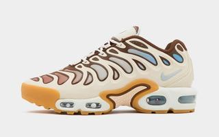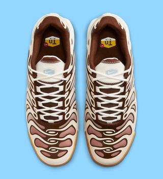 The first pair to surface steers clear of the traditional Air Max Plus' dynamic, color-soaked palettes. Instead, it elegantly embarks on a journey of subtle contrasts. Shades of sail, brown, and light gum harmoniously mesh, presenting a chic, understated canvas that subtly magnifies the Drift's pronounced design alterations. This poised colorway, however, does not shy away from celebrating the Air Max Plus' heritage. The signature gradient effect is lovingly retained, with the mesh uppers transitioning from a rich brown toe through a pristine white midfoot, culminating in a gentle sky blue towards the heel. This serene blue touch gracefully extends its presence to the branding, Air supports, and underfoot tread, completing the shoe's visual narrative.