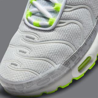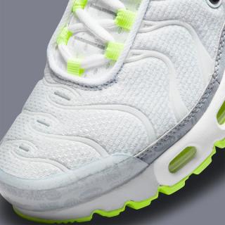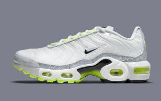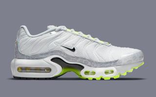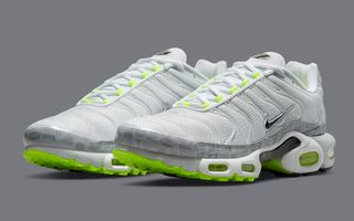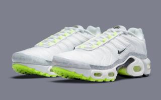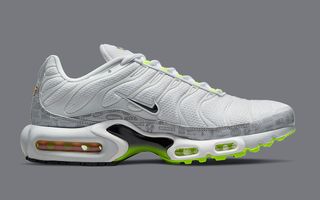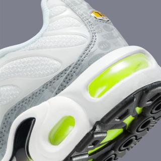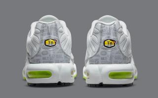 As per the aforementioned Air Max 95, this TN takes on the same white, grey, and neon hues in a fairly similar arrangement. White mesh uppers are matched with solid white vein caging, trim and toe caps. White outlined black Swooshes rest noticeably at the midfoot and provide a stark counter to the vibrant neon hues of the eyelets, outsoles, and Air supports. The pack’s championing retro logo print is presented on the grey mudguard wrap and the pair is capped off with a black and neon gradient midfoot shank, and full neon insole sets.