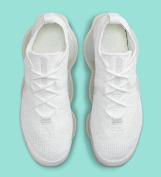 Dressed primarily in bright white, the pair deviates through milky translucent at the midsole clip and bulbous Air supports, with light mint Swooshes worked into the upper’s weave for the pair’s only pops of color. The vamp, forefoot, collar and rear pull all arrive with a plush chenille-like texture adding a subtle-yet-simple point of difference to the drop.