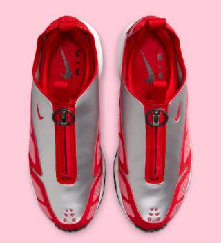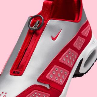 This modern iteration keeps true to the silhouette’s tech-forward DNA, blending a metallic silver upper with bold Fusion Red overlays and a matching zipper system running through the forefoot. A ring pull tab and exposed Air Max cushioning unit in the heel add functional edge and comfort, while the black rubber outsole provides durability and grip underfoot.