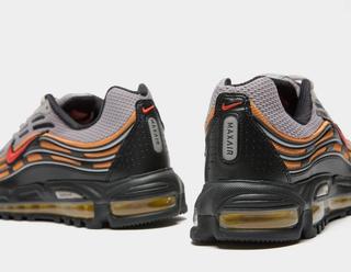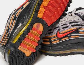 The pair features a breathable grey mesh upper with layered black and orange synthetic overlays that nod to the model’s early-2000s DNA. A gradient red-to-orange Swoosh cuts through the sides, echoing the fiery ceramic tones that wrap the upper trim. Branding details hit the tongue, toe, and heel with MAX AIR callouts, all sitting atop a full-length Air Max unit tinted in amber and anchored by a durable black outsole.