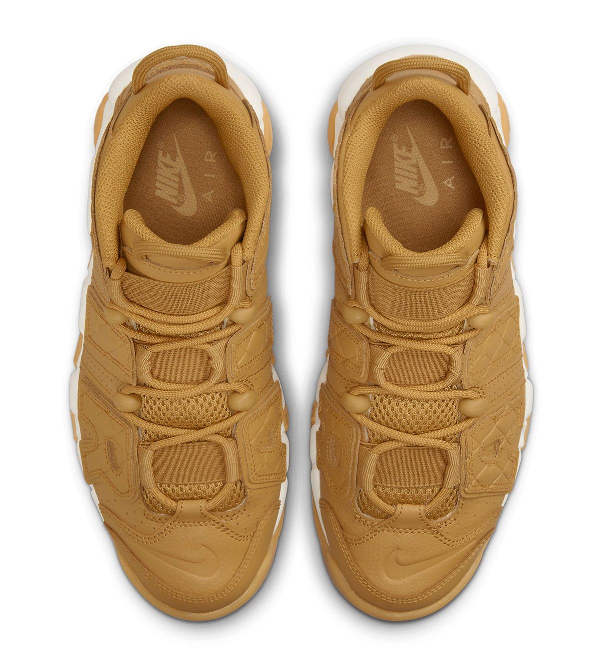 Clad in simple color blocking, the pair works with an upper entirely of “Wheat,” with midsoles of white, and outsoles of light gum that’s so often seen on autumnal footwear releases. Also common is the pair’s mix of materials across the top, with a simple tumbled leather upper working with staple mesh tongues and nylon pulls. Here, though, the Swoosh has differentiated the release through special quilting detail done atop the profile “AIR” letter overlays — a finish also seen on this recently-revealed Nike DUnk Low.
