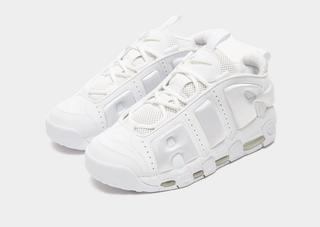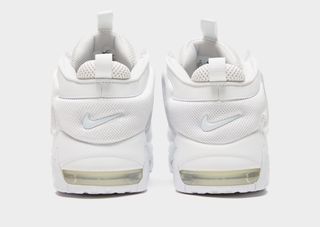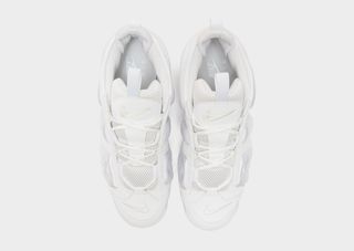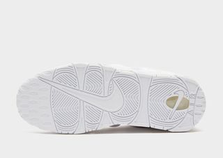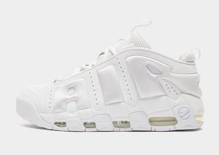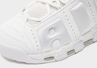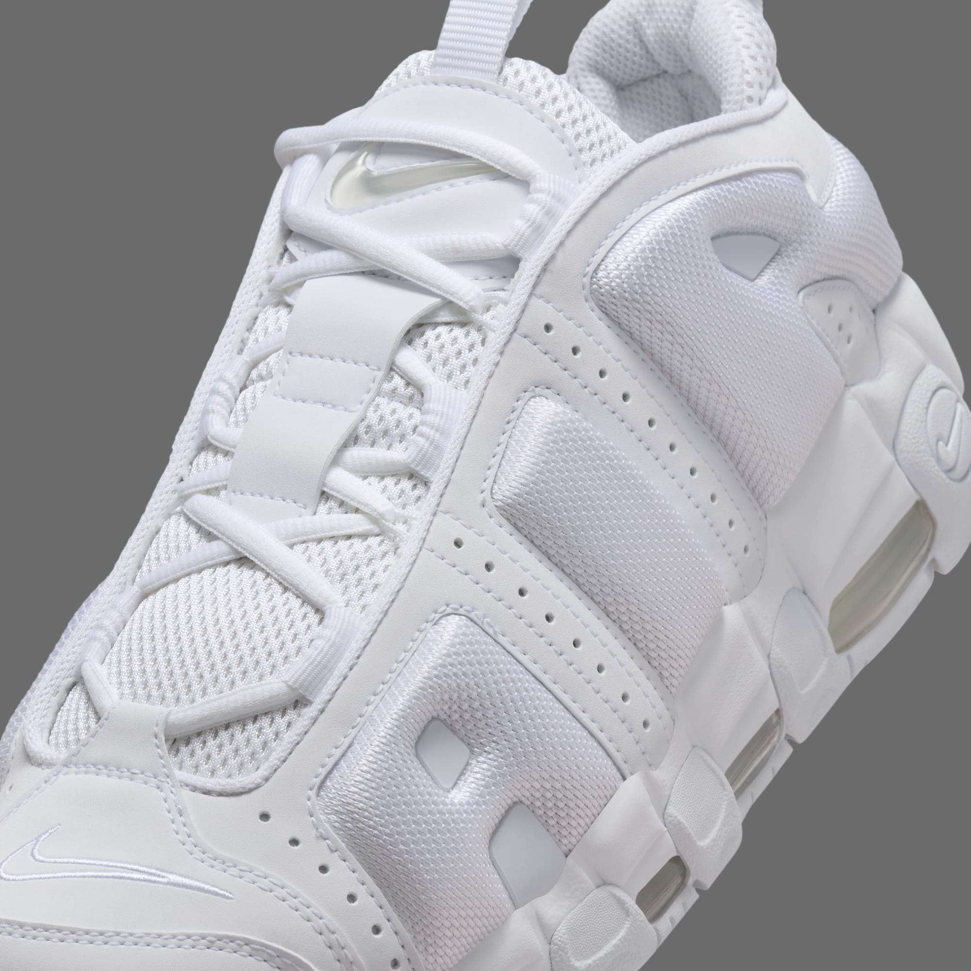 The Nike Air More Uptempo Low "Triple White" features an all-white upper that exudes a sleek, monochromatic look. This minimalist approach allows the silhouette's distinctive design elements to stand out, including the oversized "AIR" branding which is subtly outlined on the sides. Adding a touch of elegance to this stark white ensemble is a jewel Swoosh located on the heel and tongue, providing a slight shimmer that catches the eye without overpowering the shoe’s overall aesthetic.