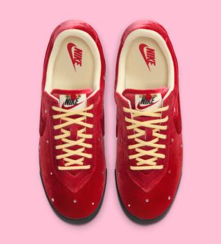 Not traditionally associated with performance footwear, soft velvet material covers the entirety of the sneaker's upper, donning a ruby color throughout. Shimmering silver stars and other icons are decoratively presented across the upper, added another special touch to the style. A small rose lands on the top-of-the-tongue, potentially speaking to the "Gym Red" makeover's inspiration. The upper's presentation is recreated on the shoe box, offering one of the Swoosh's more elevated packaging styles to date.