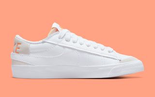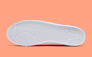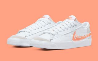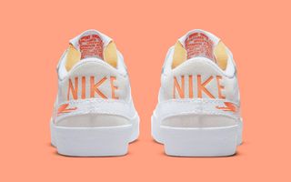 Though its design — and its newfound Swoosh — is audacious as, its material construct and color scheme are anything but. Here, it’s typical smooth white leather and neutral suede resting atop an all-white sole unit that sets up a handful of sherbert-orange pops — most noticeably on the titular midfoot paintwork.