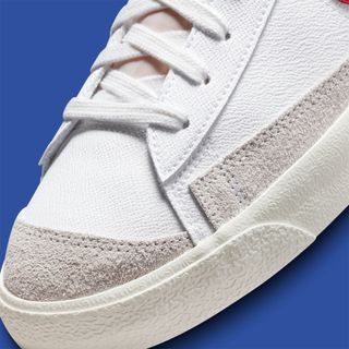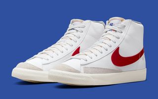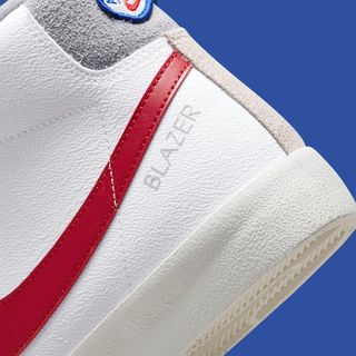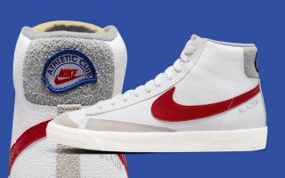 Though its blocking and hues are something oft-seen, the pair presents an entirely new construct, with woven uppers of white adding a crinkle texture throughout the entire upper. It’s set against striking Gym Red Swooshes, and, in case you needed reminding, “Blazer” glazed just below onto the lateral heel. Its suede overlays at the forefoot and heel, and its sail sole unit remain unchanged, there are select embellishments that give the pair its defining theme; Retro-inspired Nike Athletic Club tongue tags and insoles are reminiscent of the model’s era, with special suede heels and sew-on patches furthering the pair’s heritage feel.