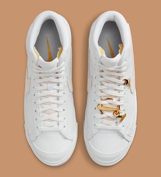 Here, its the bling that gives the pair the most character, with gold Nike pendants, Swooshes, and ring bling — all interchangeable and removable. It rests atop a straightforward, unassuming arrangement, with tumbled white leathers forming the majority of the build. It deviates from this only once, with neutral suede Swooshes sitting at the midfoot. All of this rests atop an all-white sole unit, with tinted nylon tongues and tonal branding at the heel rounding out the design.