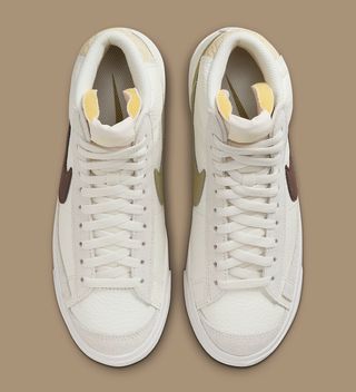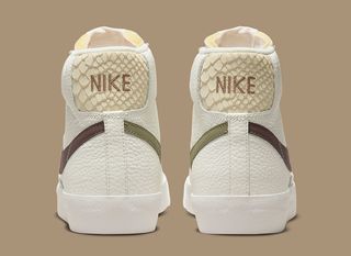 Focusing on heavily-tumbled sail leathers, the pair is met with tonal suede overlays at the toe and eyestays, with color-matched sole units, tongues, laces and liners providing a bright base. From there, creamy-tan reptile textures take over the heels, while smooth leather Swooshes round out the design in alternating hues of brown and olive.
