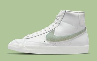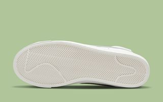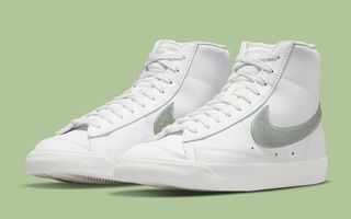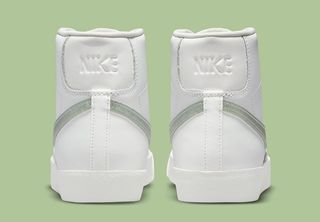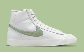 Just like Air Force 1s, the Blazer also arrives anchored on a classic all-white leather construction. It’s kept all-white at the laces, liners, and sole units, too — even the branding in the back featured a tonal debossed finish. All of this sets up the pair’s champion, the glittered green Swoosh, which rests at the midfoot in hard plastics.
