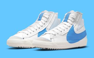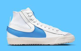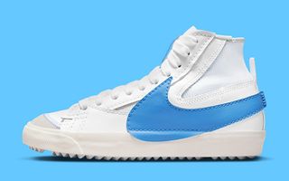 After first revealing itself in a Trailblazers-inspired colorway, it didn’t take long for the Nike Blazer Mid Jumbo to pursue its OG’s perpetual “Color Swoosh” series, with the silhouette since sprouting in several white-based, color-Check colorways since. The next to appear brings a little college flavor to its staple white and sail base by proffering University Blue color accents for a classic scheme.