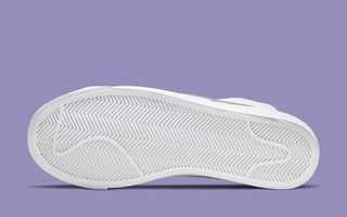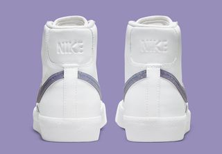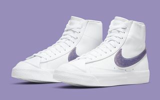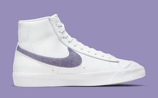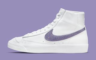Just like Air Force 1s, the Blazer also arrives anchored on a classic all-white leather construction. It’s kept all-white at the laces, liners, and sole units, too — even the branding in the back featured a tonal debossed finish. All of this sets up the pair’s champion, the purple glittered Swoosh, which rests at the midfoot in hard plastics.