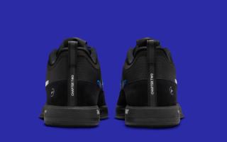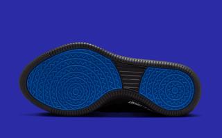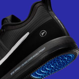 The pair is built around a predominantly black upper, paired with a contrasting white Swoosh for a sharp, high-contrast look. Royal blue accents land on the outsole, giving the shoe a subtle pop while nodding to classic Nike Basketball color blocking. Fragment’s influence is kept restrained, with small co-branding details integrated into the design rather than overt logos.