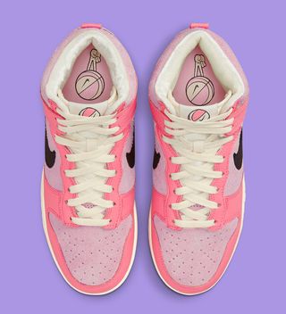 Whilst the gents received pairs clad in bone, white, black, and orange, the girls get fitted in pinks and pastels; the pack’s Nike Dunk relying heavier on the former. Here, it sports a shaggy light magenta upper with overlays of candy pink leather working with the surrounding white and sail of the tongues, laces, and midsoles. A striking black Swoosh sits at the midfoot in tumbled leather, with the pack-specific branding at the tongue and insole rounding out the design.