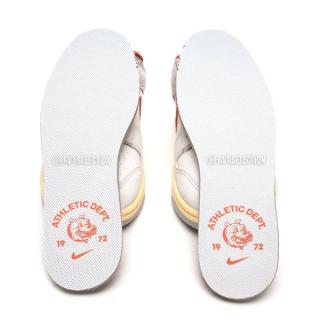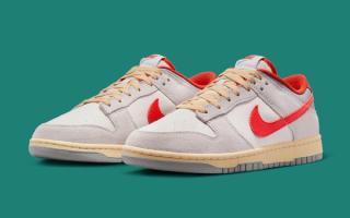 Anchored by an off-white canvas upper, mid-grey leather collar, and a set of soft grey suede overlays, the pair’s monochrome base is amped ups by bold red cracked Swooshes that buy into both the collegiate and vintage-look themes. Laces and midsoles receive that old-school sail tint, with retro-inspired college athletic branding on the insoles confirming the pair’s retro story.