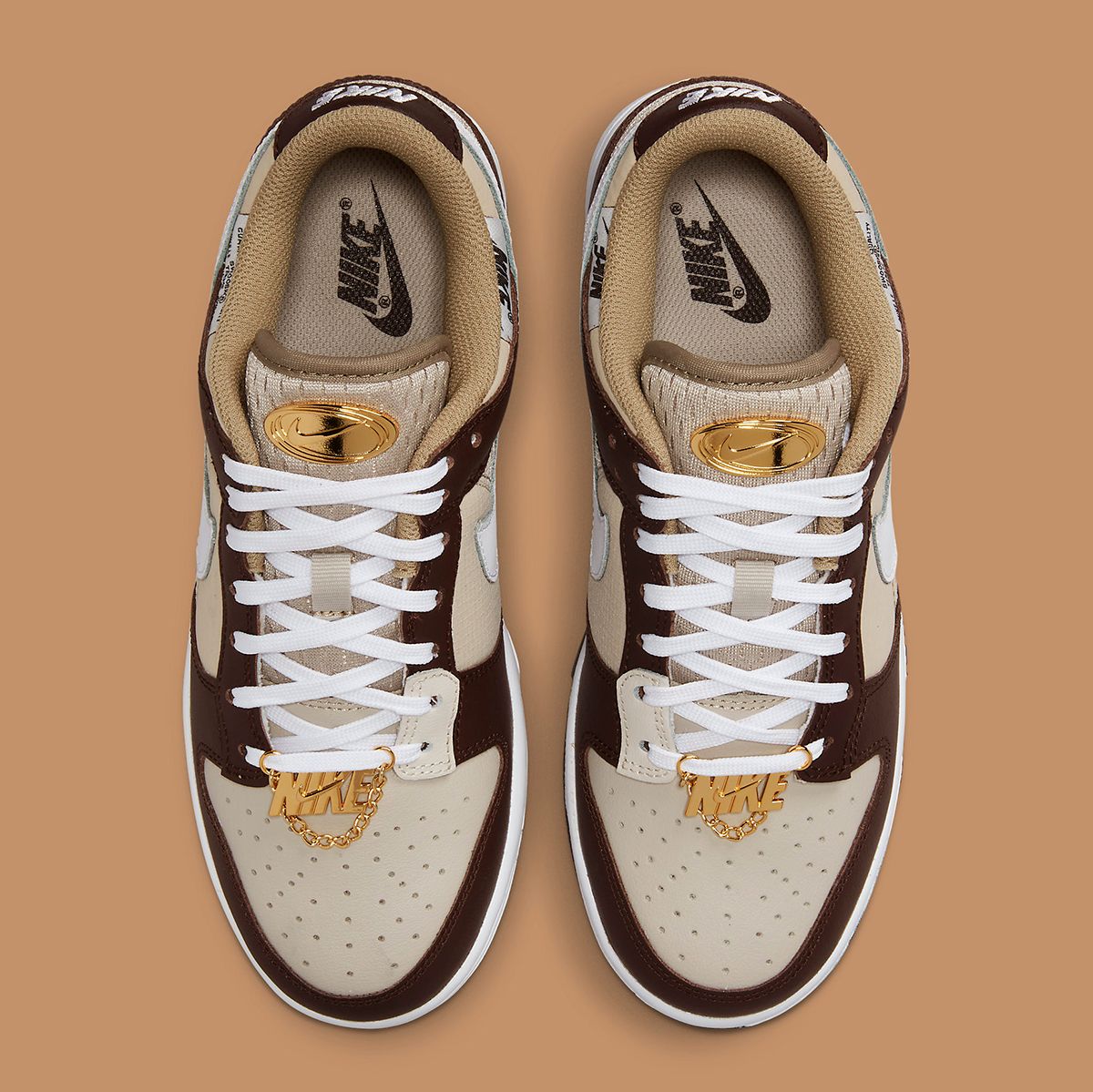 Sure, this new Nike Dunk Low “Bling” has been hit with striking Nike chain dubraes and shimmering tongue tags — but that’s the very least of what’s going on on this new release. A quick look over the pair will reveal a haphazard construct of mesh, leather, ripstop, and burlap, with segmented paneling, misplaced tags, and added overlays — the detail is crazy! Despite how audacious the design is, the color scheme and the aforementioned bling adds leveled-up elegance, with light tans uppers, chocolate leather overlays, bright white Swooshes, laces, and midsoles, as well as metallic golds leaving a tasteful tase in one mouth.