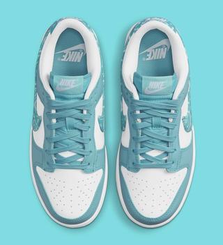 The "Blue Paisley" iteration of the Nike Dunk Low remains true to its original form, featuring a clean, crisp white leather base complemented by light blue-green overlays. The traditional sole unit maintains its classic aesthetic, while the choice of blue nylon for the tongue adds a subtle twist to the conventional color blocking. However, the distinctive paisley print that truly sets this model apart, adorning the Swoosh and heel overlay in a thick twill fabric that draws the eye and underscores the sneaker's unique appeal.