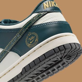 Further enhancing this retro-inspired theme are touches of gold that elevate the sneaker's luxurious feel. Gilded Nike Basketball branding adorns the lateral ankle, tongue, and insole, bringing a sense of prestige to the design. The heel features a Nike motif in gold, and the Swoosh sports contrast stitching with an eroded finish that adds to the worn-in, cherished look of the shoe. Even the midsole threadwork glimmers in gold, tying together the overall design with a hint of opulence.