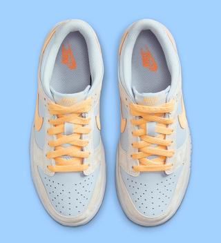 The design is a striking blend of soft pastel blue uppers that offer a calming aesthetic reminiscent of clear, serene skies. But the true standout feature lies in its unique overlays. Finished in an alabaster shade that mirrors the gentle gleam of pearls, these elements are anything but ordinary. They present a matte appearance, yet they're rich in textural touch, conjuring the feel of a sophisticated canvas adorned with tonal watercolor blotches. This dreamy, serene backdrop serves as the perfect setting for the vibrant "Melon Tint" accents that command attention on the Swoosh overlays, laces, and brand markings.