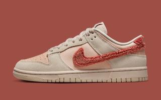 Seeing a shift to premium tooling, this new Nike Dunk Low looks to top-shelf finishes like premium tumbled leather uppers and crochet-mesh tongues of warm blush hues, and pairs it with lightly-sueded overlays of “Sanddriftr” and Swooshes of shaggy brown terry. The latter is joined by matching heel overlays and a color-synced tongue logo, before a solid beige sole units rounds out the design.