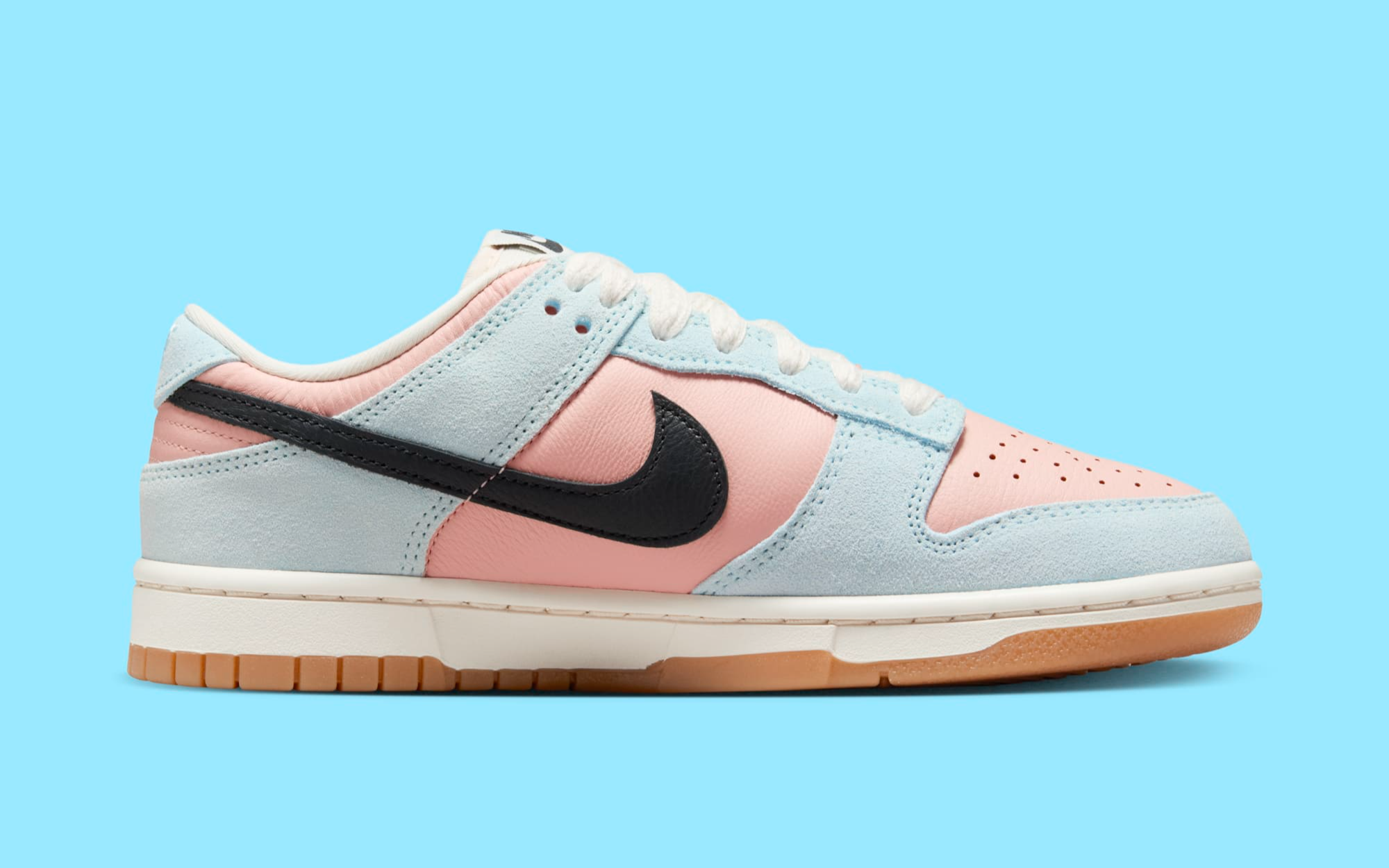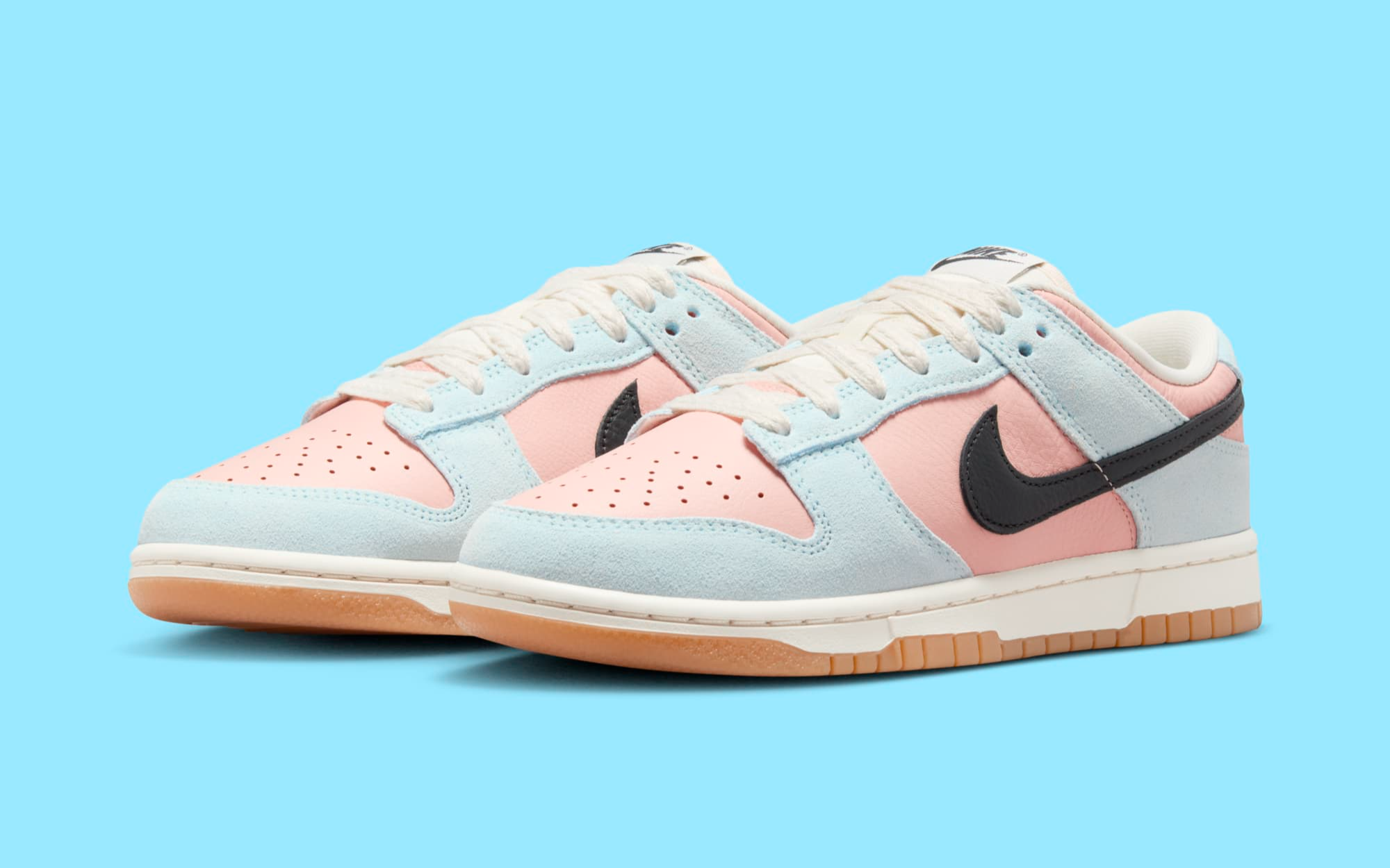 The standout features of this Dunk Low include the crisp black Nike Swoosh cutting through the icy and warm hues, adding a classic touch to the contemporary color scheme.