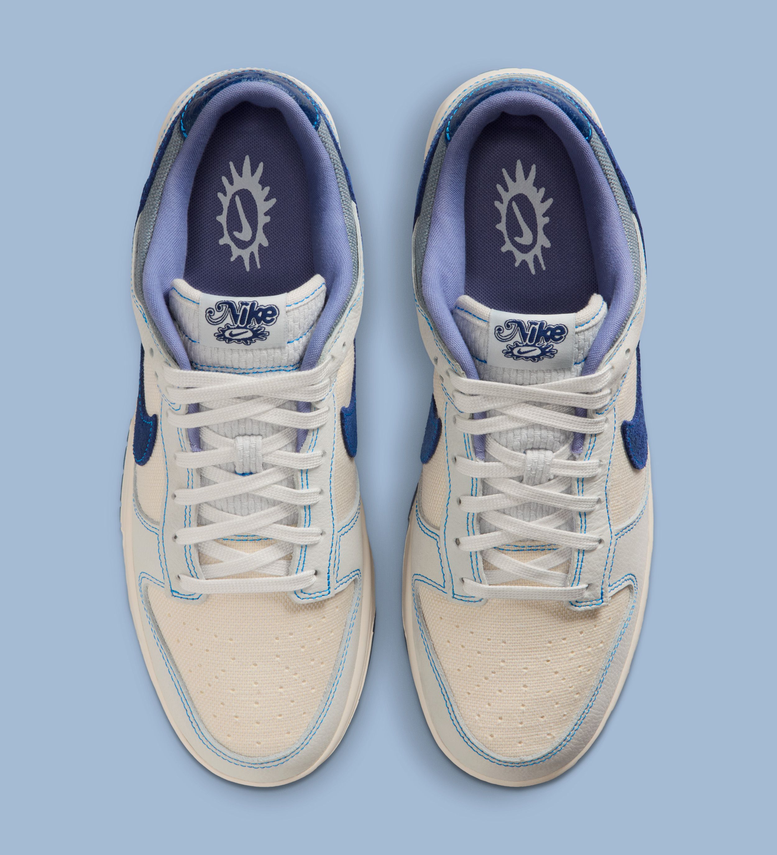 The upper is built primarily from canvas, covering the toe box, mid-panel, and quarter sections. This choice gives the shoe a more casual feel compared to traditional leather Dunks, while also allowing the contrast stitching to stand out more clearly across the overlays. Those overlays arrive in a soft grey suede, outlined with bright blue stitching that adds definition without overpowering the base color.