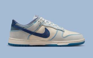 A deeper navy suede Swoosh anchors the side panels, introducing a richer texture and a subtle contrast against the lighter canvas body. The same blue tone appears on the outsole, creating visual balance from top to bottom. Underfoot, the Dunk’s familiar cupsole remains unchanged, keeping the shoe grounded in its original basketball roots.