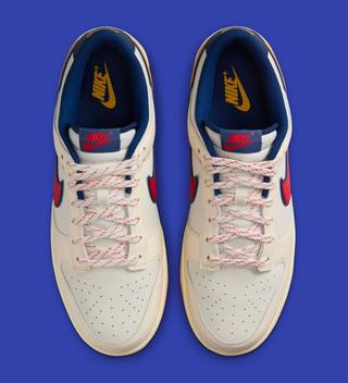 Focusing on the Dunk Low, this sneaker features a vintage-inspired sail and cream leather upper that offers a subtle contrast against the shoe's overall bulk. However, the standout element is undoubtedly the vibrant royal-trimmed red-to-orange gradient Swoosh overlays, which create a dynamic visual impact. Additional retro-inspired details include branded rear heels and pixelated laces that complement classic gaming aesthetics. Completing the look is a striking sail and crimson sole that ties the design together.