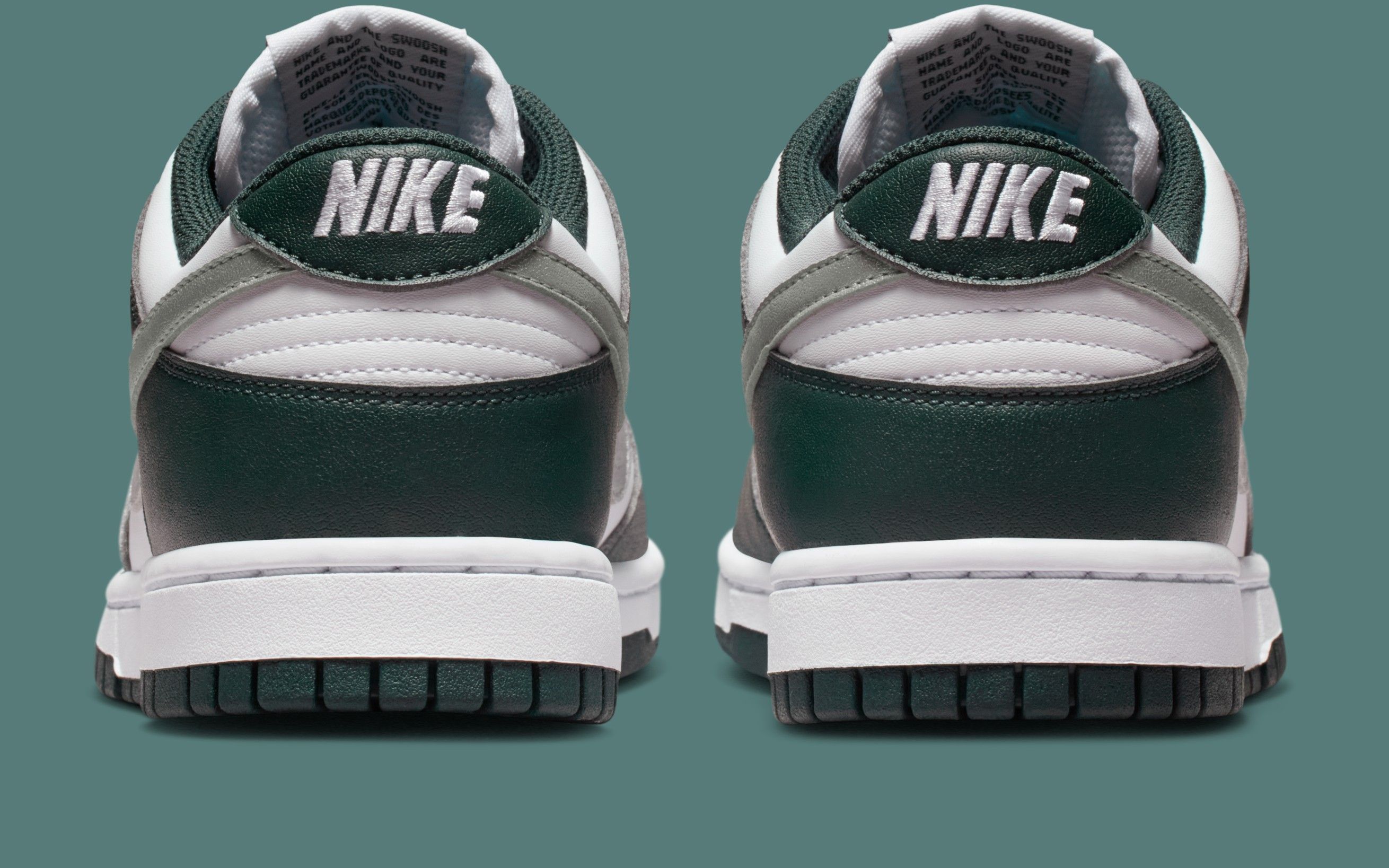 The upper combines smooth white leather panels with dark green overlays, giving the sneaker its aquatic tone. A light grey suede Swoosh and matching heel tab introduce slight contrast, while the nylon tongue and black laces preserve its heritage-inspired look. Completing the design is a white midsole paired with a dark rubber outsole, maintaining the Dunk’s signature balance of simplicity and durability.