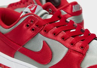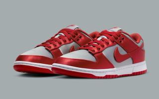 Revealed today through sources close to House of Heat, the Nike Dunk Low “UNLV Satin” is exactly that, the OG colorway delivered in a sleek satin finish. One-for-one color blocking is displayed, with smokey greys filling the upper and tongue before a bevy of rich reds drapes the pair’s overlays, laces, and liners. Of course, being a satin construct, alterations have been made to the eyestays — added hardware — and laces, too. What does remain unchanged is the simple white and red sole unit sitting underfoot that completes the design.