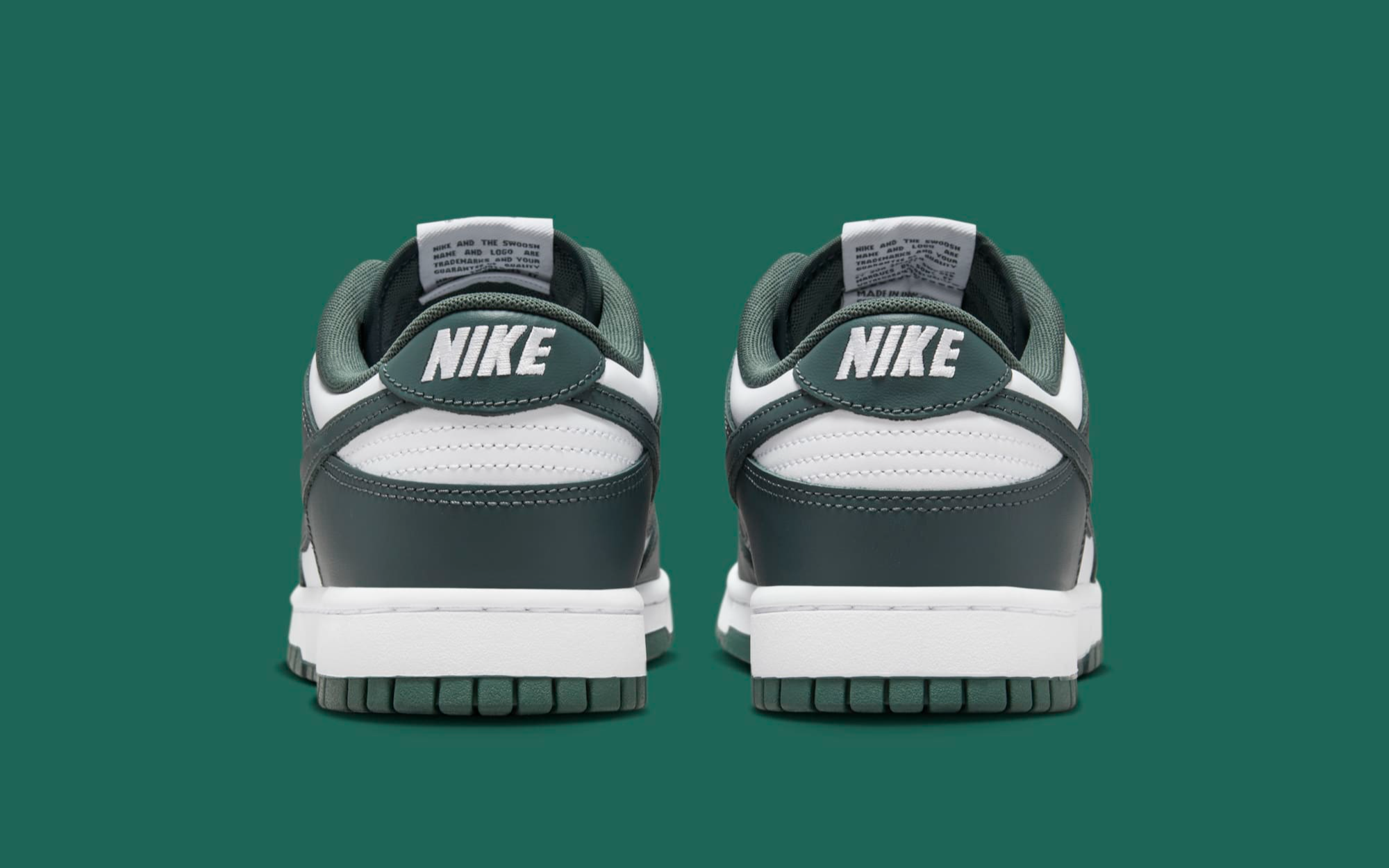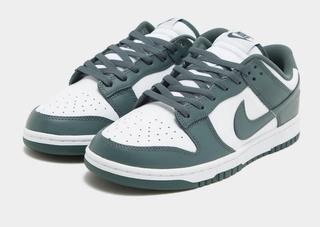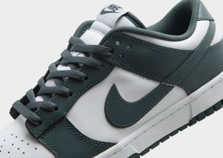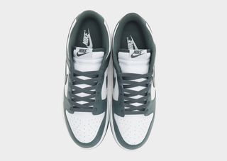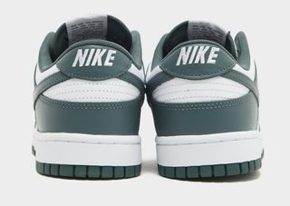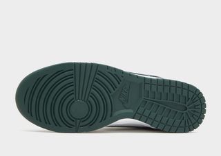 The "Vintage Green" edition of the Dunk Low maintains the simplicity and elegance of the model's design with its clean, vintage green color. This rich, deep hue covers the durable leather upper, providing a stark contrast to the crisp white midsole, a combination that pays homage to the traditional Dunk Low style while bringing a fresh vibrancy to the silhouette. Unlike the Michigan Dunk Low, which features bold orange accents, the "Vintage Green" opts for a more standard two-tone finish across the board.