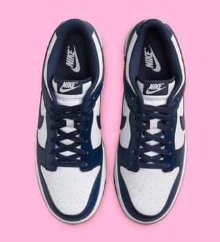This latest edition stays true to its roots, featuring crisp white leather uppers paired seamlessly with "Midnight Navy" leather overlays that embody the classic Dunk aesthetic. The design continues with white nylon tongues and midsoles, while navy accents are strategically placed on the laces, liners, and outsoles, encapsulating the shoe's sleek and timeless look.