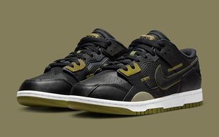 First looks at the Nike Dunk Scrap “Black Olive” reveal something fairly simple for such an audacious design. Here, its all-black base covered a typical mesh and leather build, with white midsoles and olive green outsoles underfoot. Back up top, a light peppering of olive accents flutter through the design, from the forefoot suede pops to the profile Swoosh trim, to the insole’s split branding.