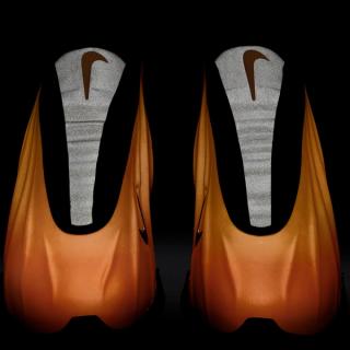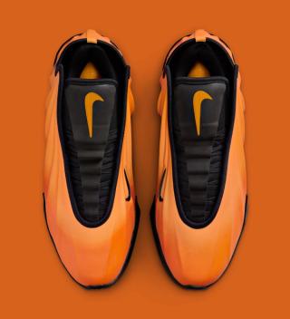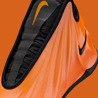 A striking “Bright Ceramic” covers the molded synthetic upper, giving the shoe a molten, flame-like appearance. The unique draped construction features sculpted grooves that add movement and structure to the form, echoing the aesthetic direction of Nike’s Foamposite and Flightposite lines. The contrast of black hits on the midsole, inner liner, and embedded Swoosh provides balance and visual impact.