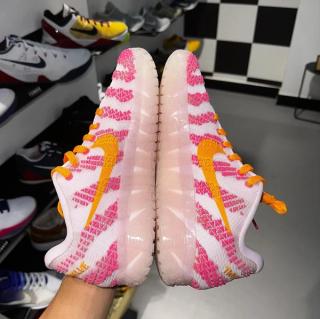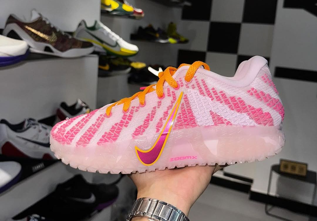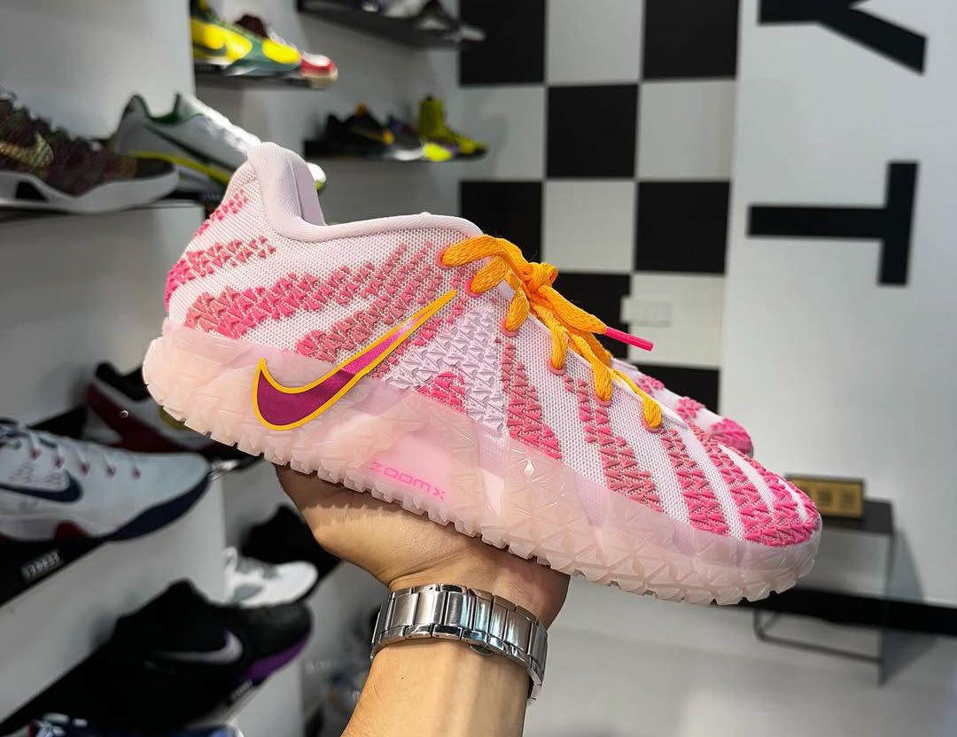 This Spring 2026 release continues to push the silhouette’s vibrant identity, pairing its lightweight woven upper with energetic hues suited for both the court and lifestyle wear. The “Bright Pink” design stands out through an expressive mix of soft pink and hot pink knit patterns that cover the entire upper, offset by bright orange laces and inner lining. The oversized Swoosh blends magenta and yellow in a gradient finish, amplifying the shoe’s lively aesthetic.