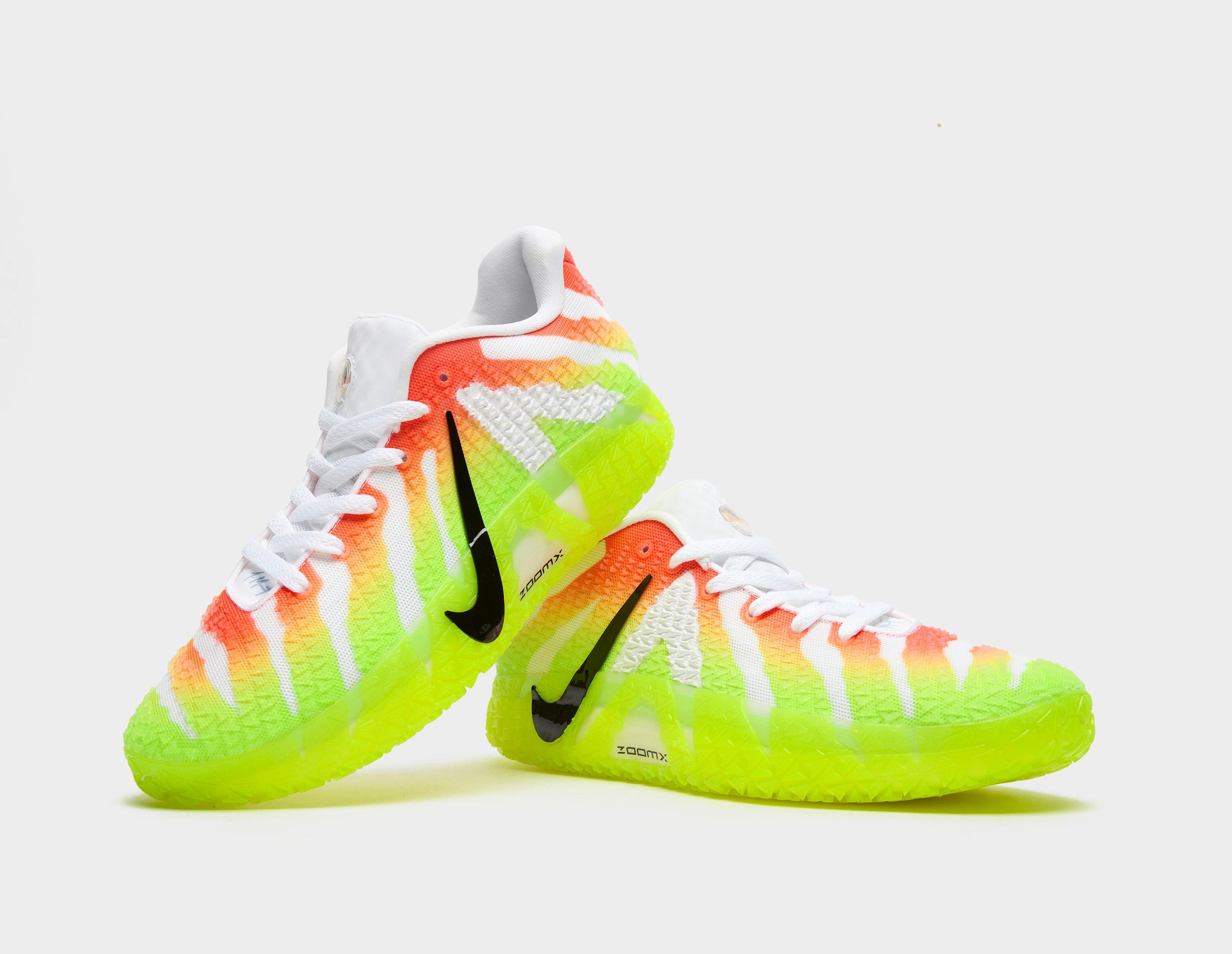 The upcoming Ja 3 "Christmas" features a vibrant "Volt/White/Bright Crimson/Black" color scheme across its cleverly crafted build. A Kobe 6 "Grinch"-reminiscent tone takes over most of the sneaker's lower-half, while gradient yellow-to-red flair animates overlays closest to the tongue and collar. The vertically placed swoosh on the lateral profile deviates from the bulk of its surroundings in "Black."