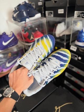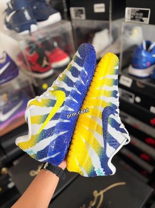 Instagram user @prm.cotd recently provided the world an early look at the popular hoops model in a "Pure Platinum/Lightning/Dusty Cactus/Deep Royal Blue" color scheme. The bold look animates the busy build with tones that reference the Kentucky-based university's signature tones. Asymmetrical presentations take over right and left shoes, with a matte silver-reminiscent hue interrupting the Racers-friendly ensembles.