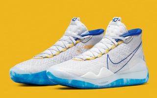 Decked out in a mix of Warrior-worn White, Game Royal, and Amarillo, the Dub Nation Nike KD 12 features a stark white upper paired with blue and yellow accents throughout it’s upper, which translucent upper enables the eye to see the Quad Axial Flywire tech. Completing the simplistic pairing is a marbleized royal blue translucent outsole and yellow-speckled hell panel overlay.