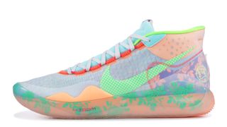 It’s Nike Elite Youth Basketball season again, and that means the exclusive (or sometimes non-exclusive) signature sneakers for the event are beginning to roll out. Here’s a detailed look at Kevin Durant’s offering for the collection, the “EYBL” Nike KD 12. The mid-top sports a greyish thin base layer, complemented by a vibrant palette of blue, green and crimson throughout. A floral print wraps the heel and runs along the midsole, while the ‘EYBL’ logo subtly pops up on the heel of the left shoe.