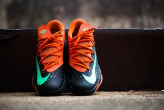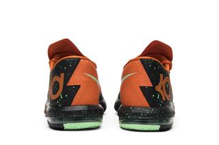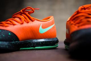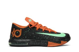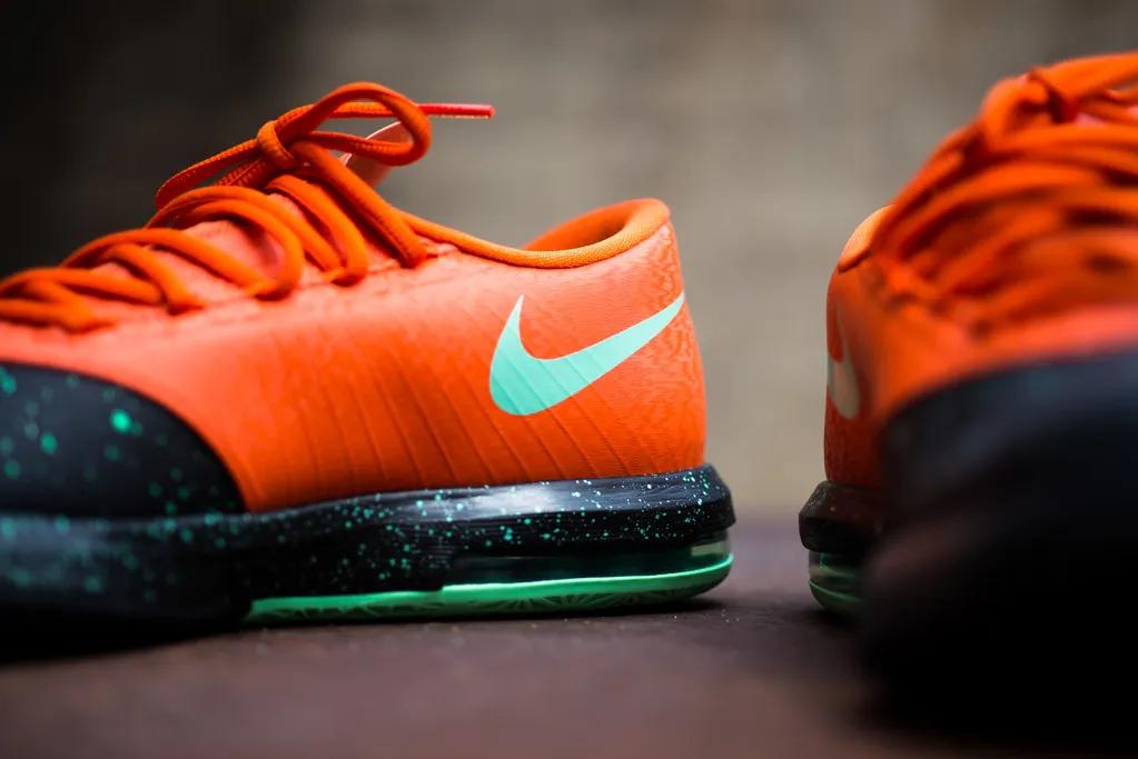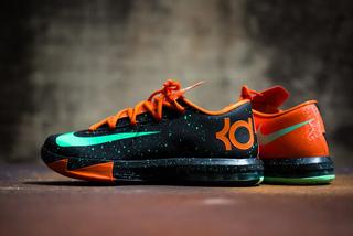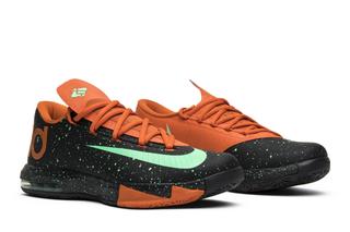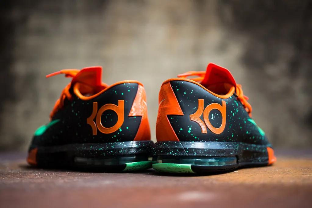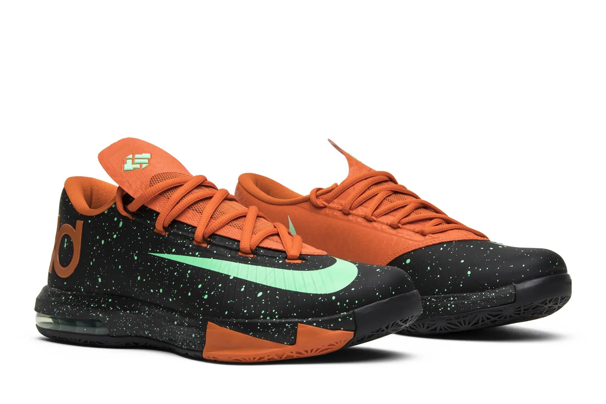The returning Nike KD 6 "Texas" channels the colors of the University of Texas, where Durant played during the 2006–07 NCAA season before entering the NBA Draft. The sneaker features a predominantly black upper finished with scattered teal paint splatter across the surface. Bright orange accents hit the Swoosh, tongue, laces, and heel branding, while a large “KD” logo appears across the lateral heel.