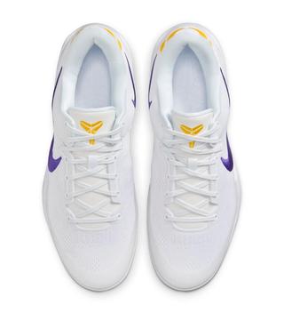 Kobe Bryant, renowned for his unwavering loyalty to the Lakers throughout his NBA journey, continues to inspire through his signature sneaker line. The "Lakers Home" iteration is a testament to his legacy, featuring a classic gold and purple scheme that perfectly encapsulates the team's spirit. "University Gold" adorns the iconic tri-tip logo on the heel and tongue, offering a striking contrast against the "Court Purple" that outlines the side Swoosh and Bryant's signature on the heel counter. Mirroring the Lakers' home jerseys, the sneaker predominantly showcases a pristine white backdrop, reinforcing its homage to the basketball giant.