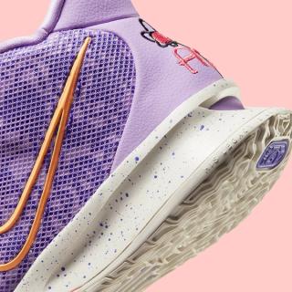 Relying on a feminine pallete of light lilac, muted salmon, sherbert orange, and sail, Kyrie pair presents an immediate tribute to his little one at the heel, with embroidered AZ and floral elements at the heel. The latter returns again to the forefeet’s teeth, and across the entire of the pair’s purple base layer. That is then covered by a light lilac sheath, and popped with sherbert hits at the tongue KI logo and the profile Swooshes. Finally, the pair is completed by a flecked sail midsoles, forefoot Zoom Air clips in pink, and two lace options in sail and purple.