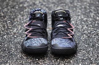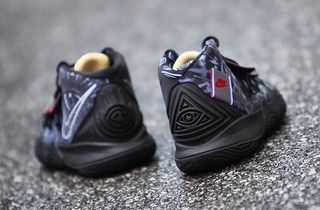 As for the color blocking and mixed bag of motifs — where do we start? Aside from being anchored in an all-over black and blue-grey upper and murdered-out sole units, there’s not one consistent print, pattern or motif to be seen. The left shoe features a Realtree camo print on the forefoot, an oversized All-Seeing eye on the quarters, and a midfoot strap ripped straight from Nike’s Planet of Hoops pack. The right shoe also features a forefoot camo print, this time Bape-style as per his forthcoming “Asia Irving” release, while quarter panels feature three intriguing aspects: tie-dye prints, exposed Nike Air tags, and 3D metallic Swooshes. Liners alternate between straight black and ASE-prints, while each branded motif sports a retrospective finishes, from “Have a Nike Day” smileys to floral embroidery seen way back on the Chinese New Year Kyrie 4. Completing the design are the few remaining consistencies, including coral-piped Flytrap overlays, Barely Volt tongue liners, and split outsoles that form one singular eye motif.
