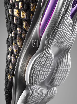 Following our exclusive first looks at the epic LeBron 17 “Future Air” comes another, with this, the first Lakers-inspired colorway to hit retailers. Based on the franchises’ alternate strip, the pair arrives anchored in jet black woven uppers, black midsoles, bold eggplant Zoom Air units, and a clean white rubber outsole. The champion of the pair is the marbelized Knitposite detail in the rear, bleeding golden amarillo, eggplant purple, and white in a dip-dye effect. Branding arrives in those three tones, too, with White profile Swooshes, embroidered King James logos at the forefoot and menacing lions eyes etched in yellow at the tongue.