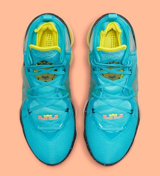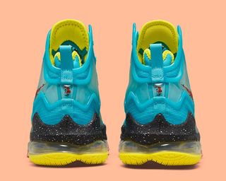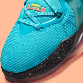 Arriving with a similar array of colors to last year’s “Beat 1-9” LeBron 18, this too features bright blue uppers, flecked midsoles, and pops of vibrant hues along the outsole and ankle. Here, though, the air is not a mash-up of precious gems, instead, it brings it’s own inspiration – and a hint at that may be spotted on the unbloomed vines along the ankle and rear Swoosh. And although it’s colorful it’s visually set in three blocks; an upper of bright blue, a striking black midsole, and a split-colored outsole.