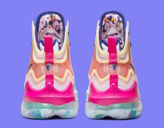 Anchored around a bright white base, the pair boasts a bevy of both bright and pastel pigments, from striking pinks at the heel, bold purples at the laces and liners, and soft greens and peachy-creams around the sole unit and caging. All of this, of course, is a reference to the beautiful floral embellishments seen on the inner bootie’s liner and outsole. There’s a handful of holiday-specific insignia, too, with special graphic consoles, cherub-bearing back panels, and special heart-shaped hangtags, too.