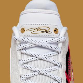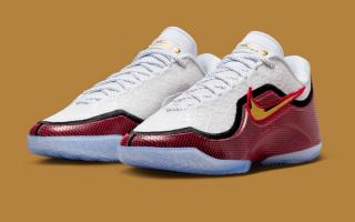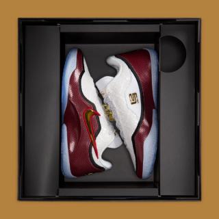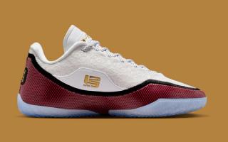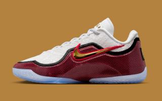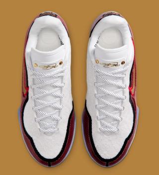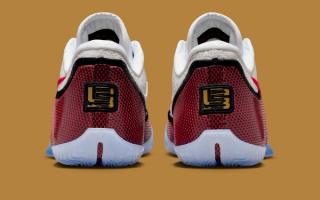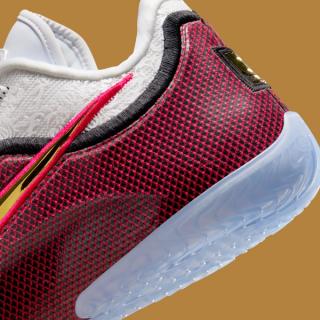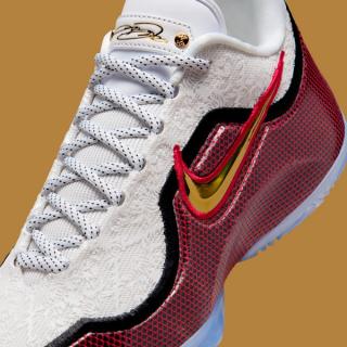 Although LeBron James' 23rd signature model differs in build and technology from its predecessor, the "Grand Opening" style draws some parallels between both designs. The Crown Containment System that wraps around the sneaker opts for a "knit" red finish, working in-tandem with the white ornate textile above to create the two-tone presentation seen on the original Air Zoom Generation. Golden lateral swooshes are rooted in the Forever King Collection's grandeur. Retro LJ23 emblems land on the medial side and spine, further connecting the modern performance model to the past. The outsole opts for a semi-translucent icy look, while the collar's inner lining includes 10-29-2003 embroidery to remember James' first NBA game.