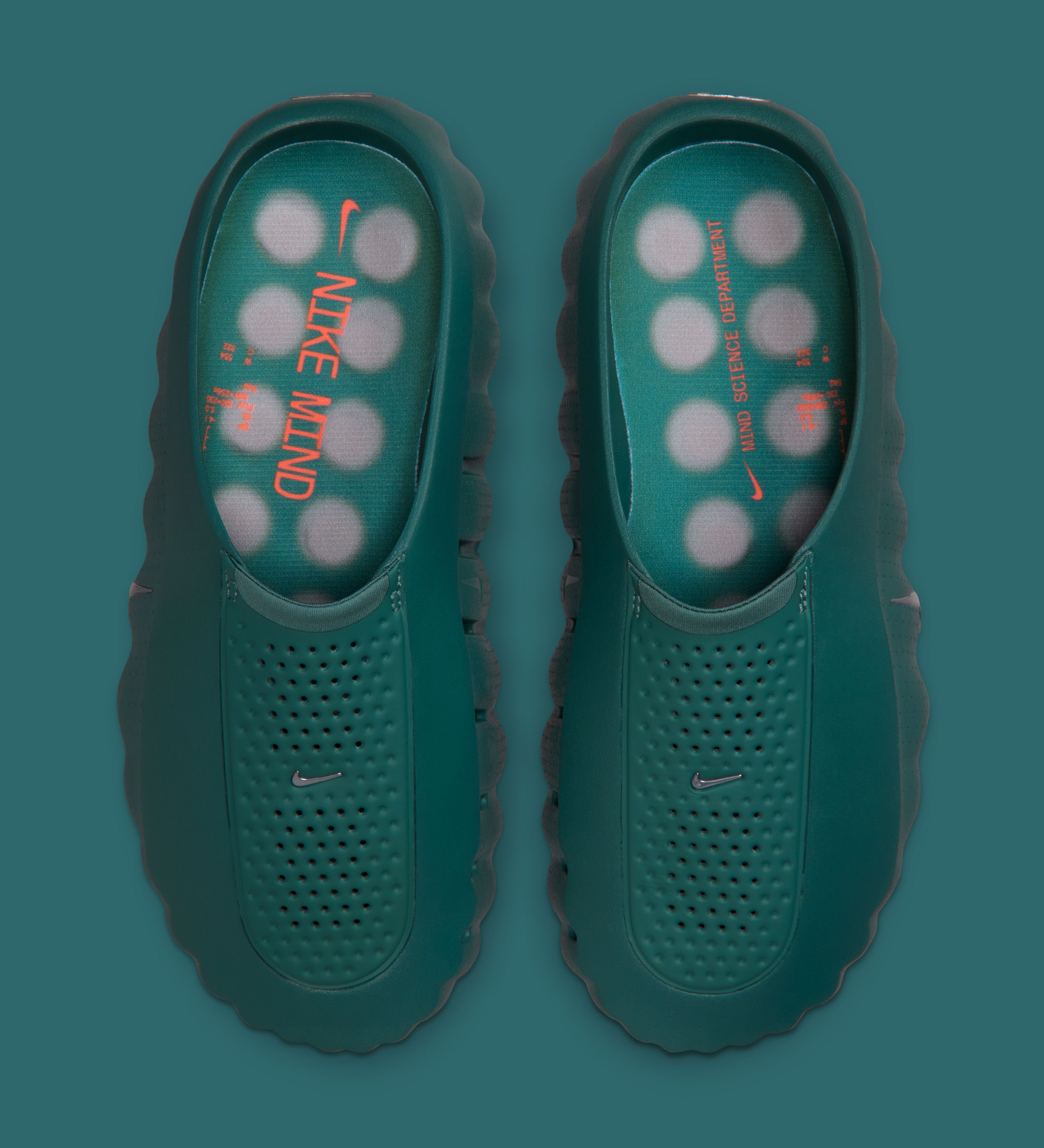 Where earlier releases leaned into high-voltage reds or stark contrasts, “Mineral Slate” takes a quieter, more considered approach. The deep green upper reads almost medicinal, giving the Mind 001 a calming, spa-adjacent presence that feels intentional rather than flashy. That restraint makes the silhouette easier to digest visually, even if the concept beneath your feet remains anything but conventional.