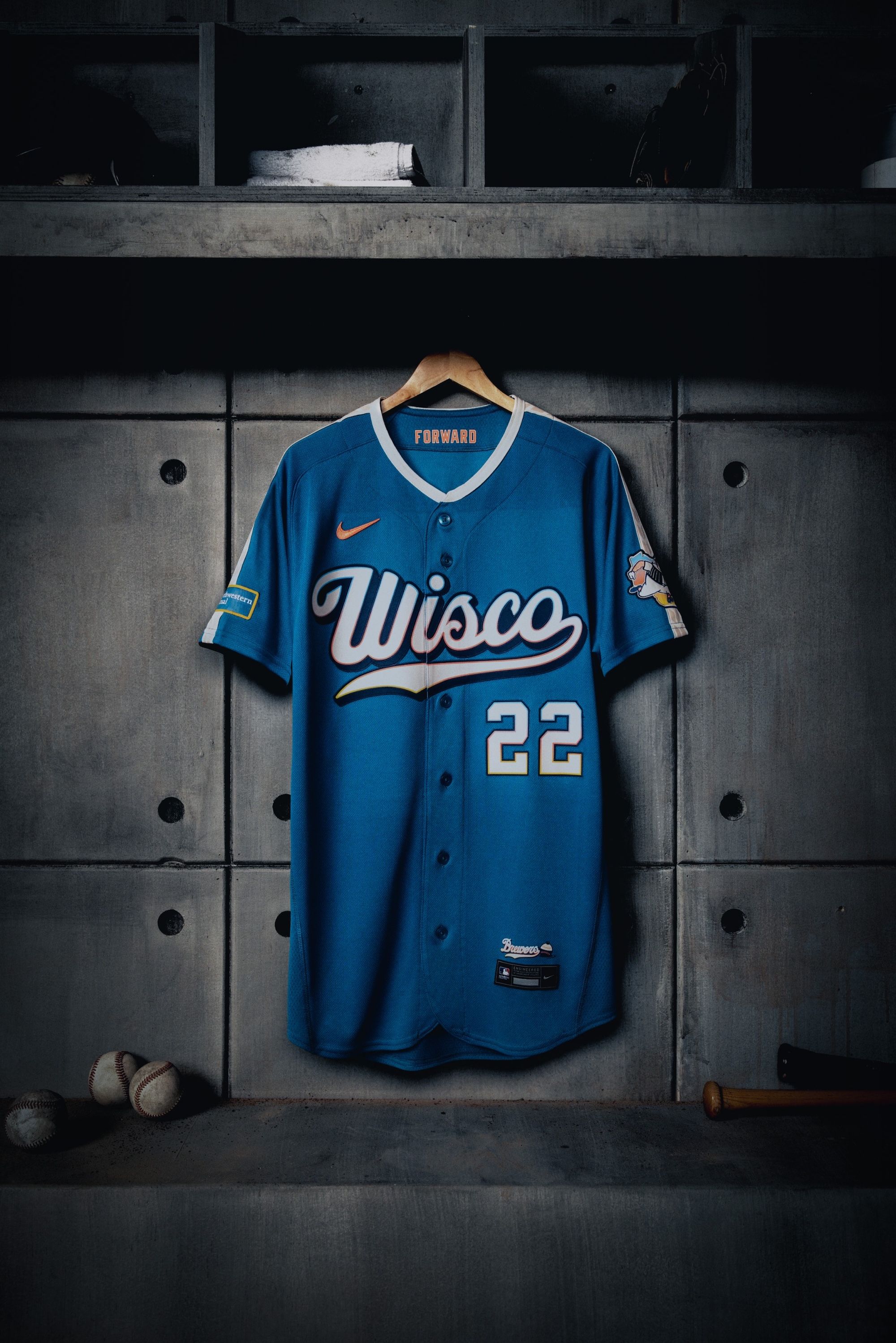 - "Wisco" text on the center of the jersey's front and a "Brewers" jock tag pay homage to tradition with their script font