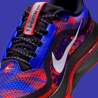 Designed to push comfort and speed forward, the Pegasus Premium takes inspiration from marathon-tested innovations while introducing a more aggressive look. The pair features a breathable engineered mesh upper drenched in an expressive Racer Blue and Bright Crimson print, contrasted by deep black overlays and reflective hits across the Swoosh and eyestays. Hints of purple and orange splatter throughout the design, creating a dynamic gradient effect that reinforces the shoe’s fast, energetic aesthetic.