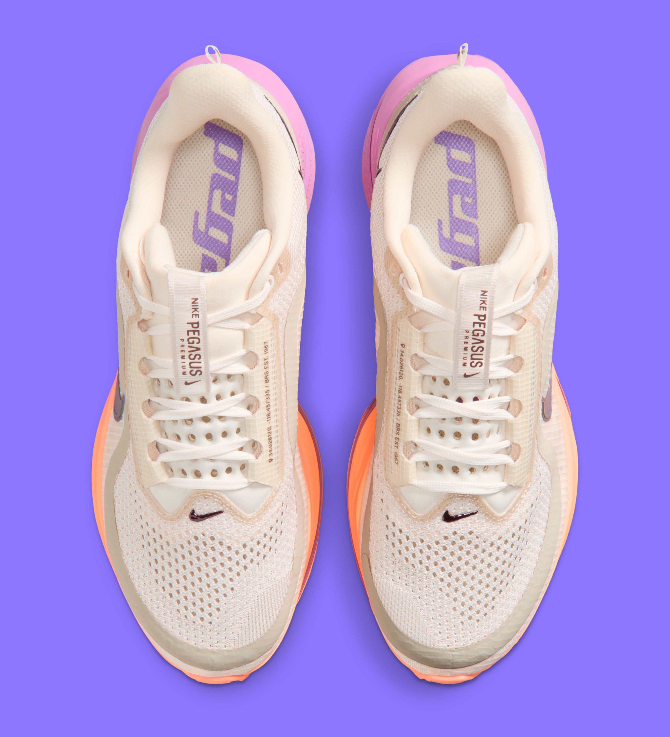 Underfoot, the full-length Air Zoom unit is wrapped in a gradient midsole that transitions from Orange Pulse at the forefoot into Light Magenta at the heel. The effect mirrors those early-morning starts and late-evening runs, giving the Nike Pegasus Premium “Chalk” a visual identity tied directly to the time of day most runners log miles.